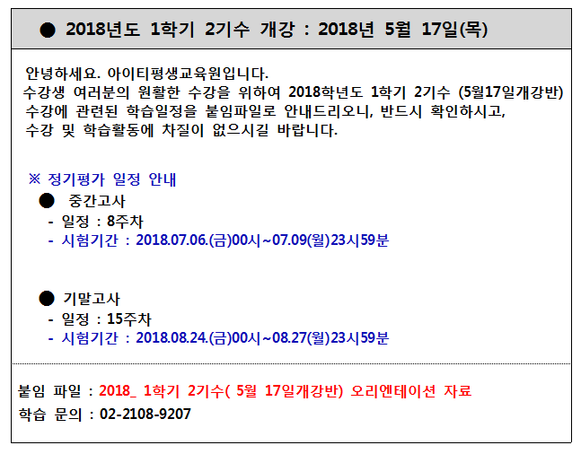 학사일정 2018년 1학기 2기수 (5월17일 개강반) 오리엔테이션 자료집 2018.03.15 아이티평생교육원 학점은행제_오리엔테이션자료(2학기1기수).pdf 이전글 목록보기 다음글